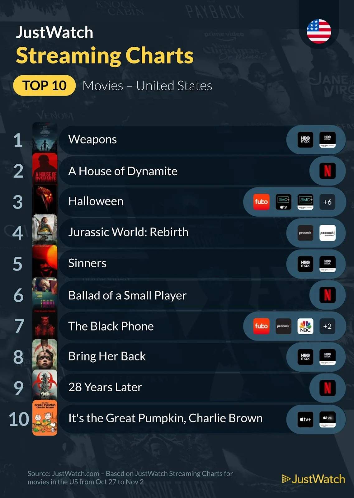 Halloween week kept audiences in a suspenseful mood — horror and thrillers continue to reign: Weapons takes the #1 spot on HBO Max.