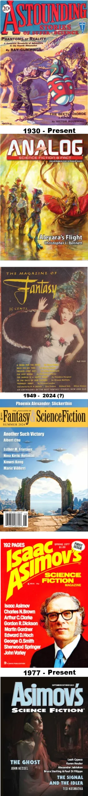 In February, it was announced that Dell Magazines/Penny Press had sold four magazines, Analog Science Fiction & Fact, Asimov’s Science Fiction Magazine, Alfred Hitchcock’s Mystery Magazine, and Ellery Queen Mystery Magazine to Must Read Media. Separately, MRM acquired the Magazine of Fantasy and Science Fiction. The longest running of these is Analog, which produced its first issue in 1930 under the name Astounding Stories of Super-Science. F&SF has been around since 1949 and Asimov’s since 1977. That’s over two centuries for these three combined!
