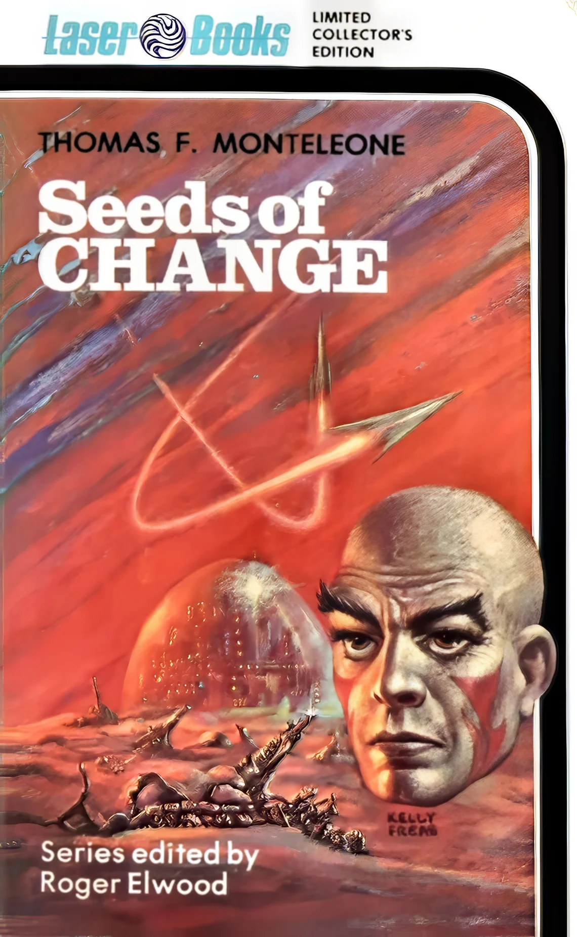 Back then I was in my late 20s and had been reading SF for most of that time, although it wasn’t my sole reading matter, but it formed the bulk of my reading matter. At that age I was still assimilating material, and hadn’t really formed any critical opinions other than “I like this but I don’t like that”; certainly not enough opinion to say definitively “this is good SF” or “this is bad SF.” So aside from providing lots of reading material, I was aware of Elwood’s compiling prowess, but hadn’t really thought much about the quality. At my first convention (Westercon 28 in Oakland, CA)—which is also the first time I met Elwood—part of the attendees’ packet was a paperback book, the so-called “Number zero” of Laser Books’ coming SF series, edited by this same Roger Elwood. This book was Seeds of Change by Thomas F. Monteleone. I understand it was also given away at some bookstores. Up until #37, when you subscribed or filled out a survey in the back of a Laser book, you also got a free copy.