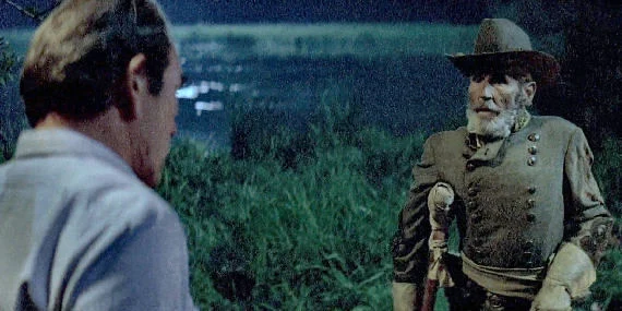 It is found that someone in Iberia Parish is abducting, mutilating, and killing young women, and during the investigation of these killings, Dave comes up against local sugar magnate Twinky Lemoyne (Ned Beatty). He also gets information from local bluesman Sam “Hogman” Patin (Buddy Guy), who tells him some of what he needs to know—but Hogman doesn’t want to run afoul of the local white power structure, so there are things he can’t tell. He also runs into an ex-Iberia Parish deputy sheriff, Murphy Doucet (Bernard Hocke), who now runs a security service, in partnership with Twinky Lemoyne, whose current client is the movie company. At a party for cast and locals given by Baby Feet Balboni, someone puts LSD in Dave’s Dr. Pepper, and he meets General John Bell Hood, who knows Dave was a Lieutenant in the Army, and tells him that venal and evil people are destroying the world he was born in. General Hood gives Dave some vague clues and tells him the he should look inside because he already has some answers.