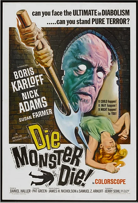 If there was ever a science fiction movie masquerading as a horror movie—with Boris Karloff, even—Die, Monster, Die, is definitely it. Extremely loosely based on H.P. Lovecraft’s “The Colour Out of Space,” and written by science-fiction and screenwriter Jerry Sohl, it’s marketed as something like a Hammer film (Figure 1). And the screenplay, though it never dips into standard horror/Hammer tropes like witchcraft, vampires, demons or monsters, certainly tries to give that sort of impression, even while it hewed to the science-fictional line of the original story. (The Hammer horror films from England were very popular in North America; there were 15 of them, ranging from Dracula movies, through werewolf, Frankenstein, Phantom of the Opera, to The Mummy and The Gorgon, from 1960 through 1965.)